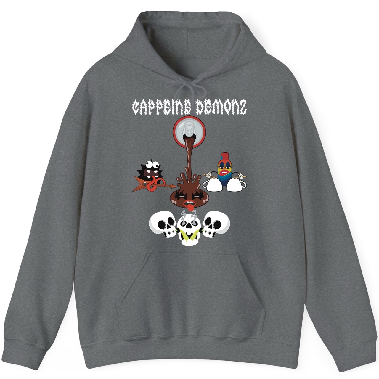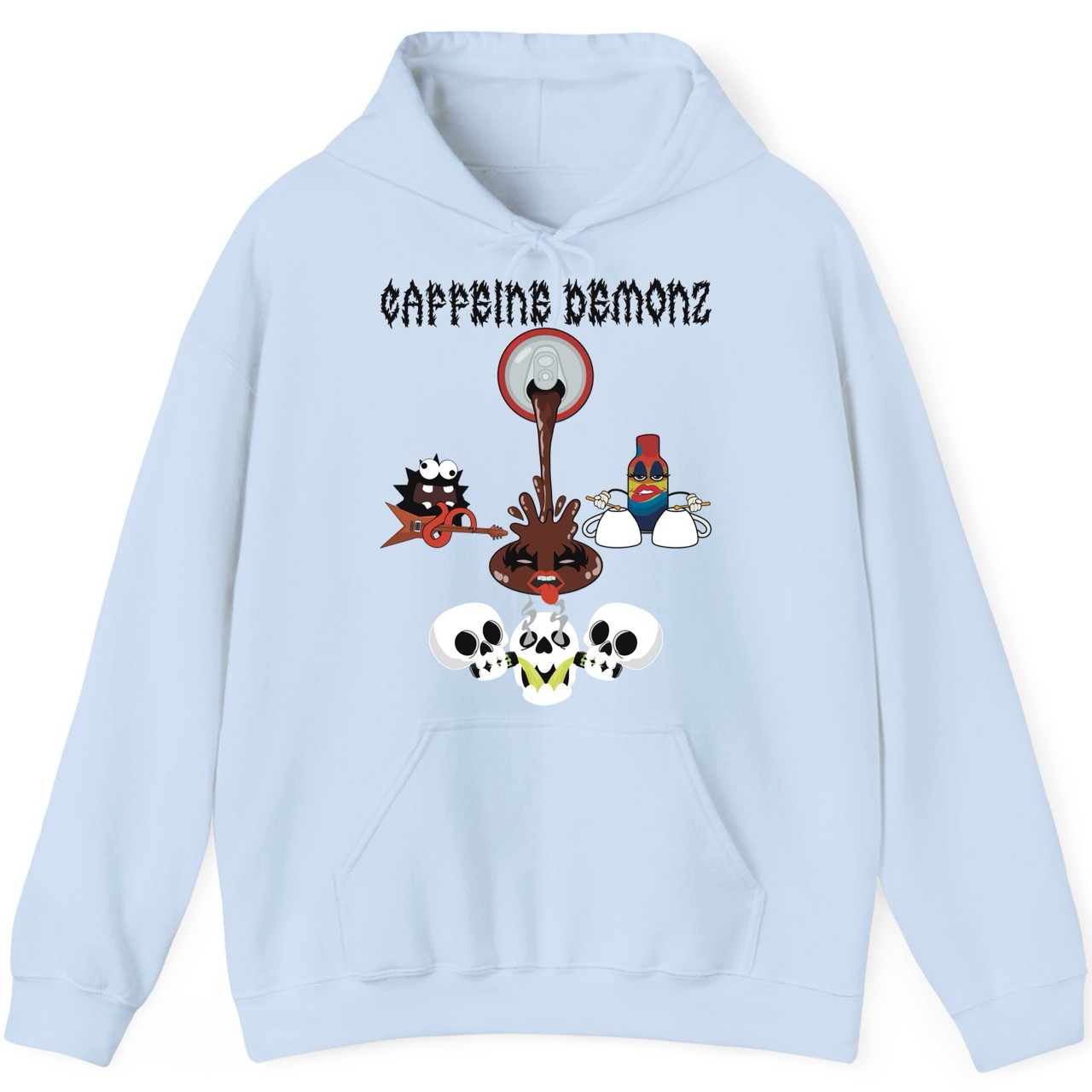 This Delulu Tees original graphic Hoodie features “Caffeine DemonZ” across the top in a bold, metal-inspired hard rock band font, designed like a vintage concert tee for caffeine addicts and music lovers. Beneath the lettering, a cracked-open soda can pours out a wild splash that transforms into the band’s lead singer, complete with dramatic eye makeup and an over-the-top tongue-out rockstar expression. On the left, a spiky, fuzzy creature shreds an electric guitar using its impossibly long tongue, while on the right a mini energy-shot bottle with heavy glam makeup plays a drum kit made from upside-down espresso cups. At the bottom, three skeletons take the chaos even further as two of them pour energy drinks into the middle skeleton’s mouth, with steam blasting out of its eye sockets like it’s reached peak caffeine levels. Cartoonish, loud, and packed with detail, this hoodie blends coffee humor, energy drink parody, and classic rock tee attitude into one statement piece that’s easy to notice and hard to forget. Designed, printed, and produced in-house in California by real people, this tee captures the Delulu Tees signature mix of playful originality, bold self-expression, and human-made artistry.