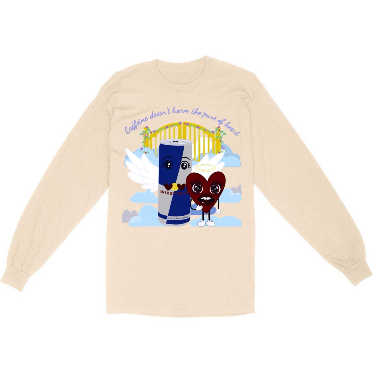 This Delulu Tees original shirt hoodie features the phrase “Caffeine doesn’t harm those pure of heart” across the top, blending sweet humor with a bold caffeine-loving message. Beneath the text, a dreamy, heavenly scene opens up with the gates of heaven framed by soft clouds, creating a bright, peaceful backdrop for the artwork. Centered in the design is a red-and-blue energy drink can, with cute expressive eyes and a friendly, cartoon personality. Standing beside it is an adorable heart character with a face, tiny arms, and little legs, bringing the “pure of heart” concept to life in a charming, lighthearted way. The result is a playful, uplifting caffeine hoodie that feels wholesome at first glance, then lands with a clever wink for anyone who runs on coffee, energy drinks, or both. Designed, printed, and produced in-house in California by real people, this tee captures Delulu Tees’ signature mix of originality, honest creativity, and feel-good humor.