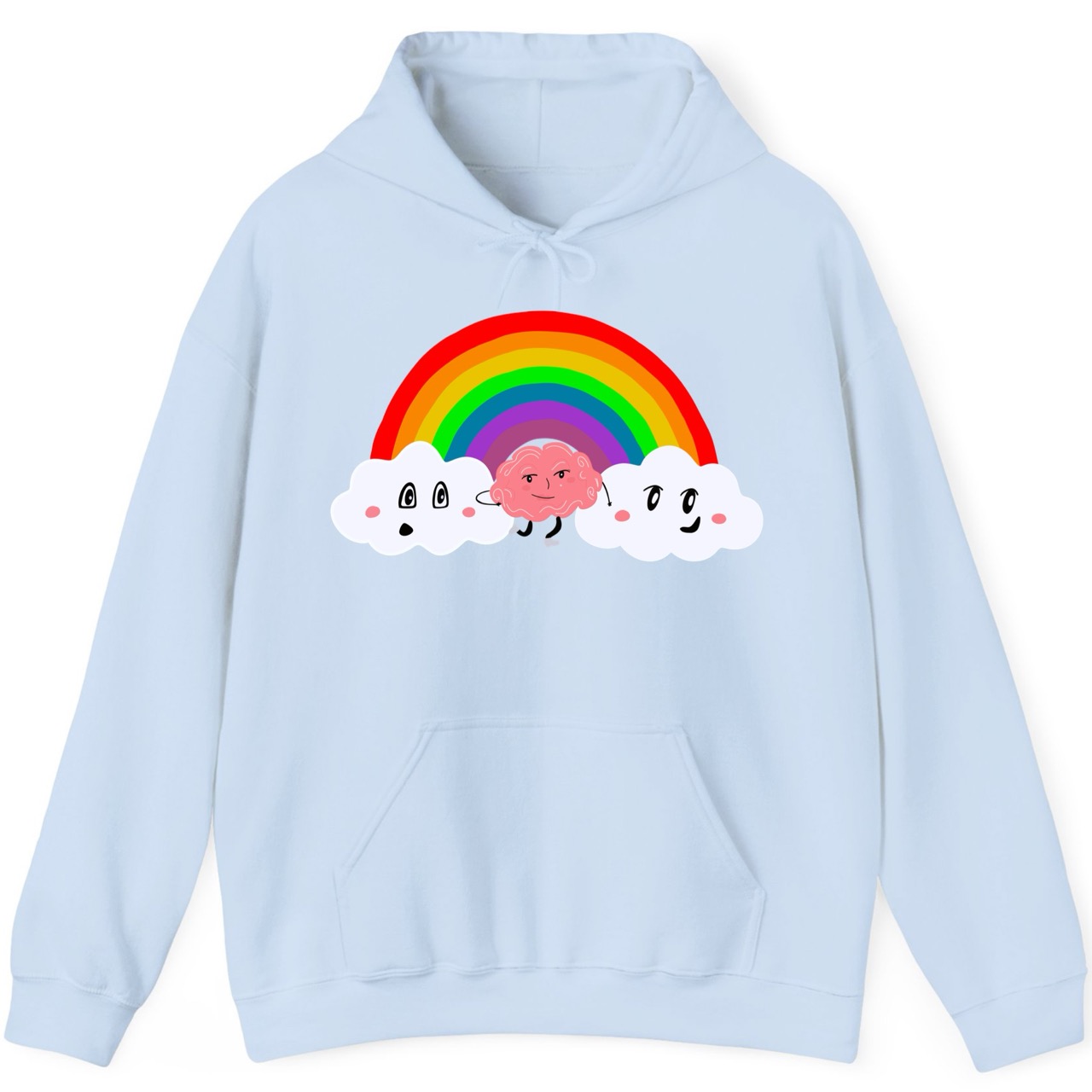 This Delulu Tees original hoodie features a cheerful cartoon brain running beneath a vibrant rainbow, framed by two adorable cartoon clouds. Designed to feel lighthearted, hopeful, and expressive, the artwork reflects Delulu Tees’ love for playful creativity and honest self expression. Designed, printed, and produced in house in California by real people, (sibling co-owners Kalie and Darian) this shirt brings creativity, quality, and honesty together in a wearable piece of art.