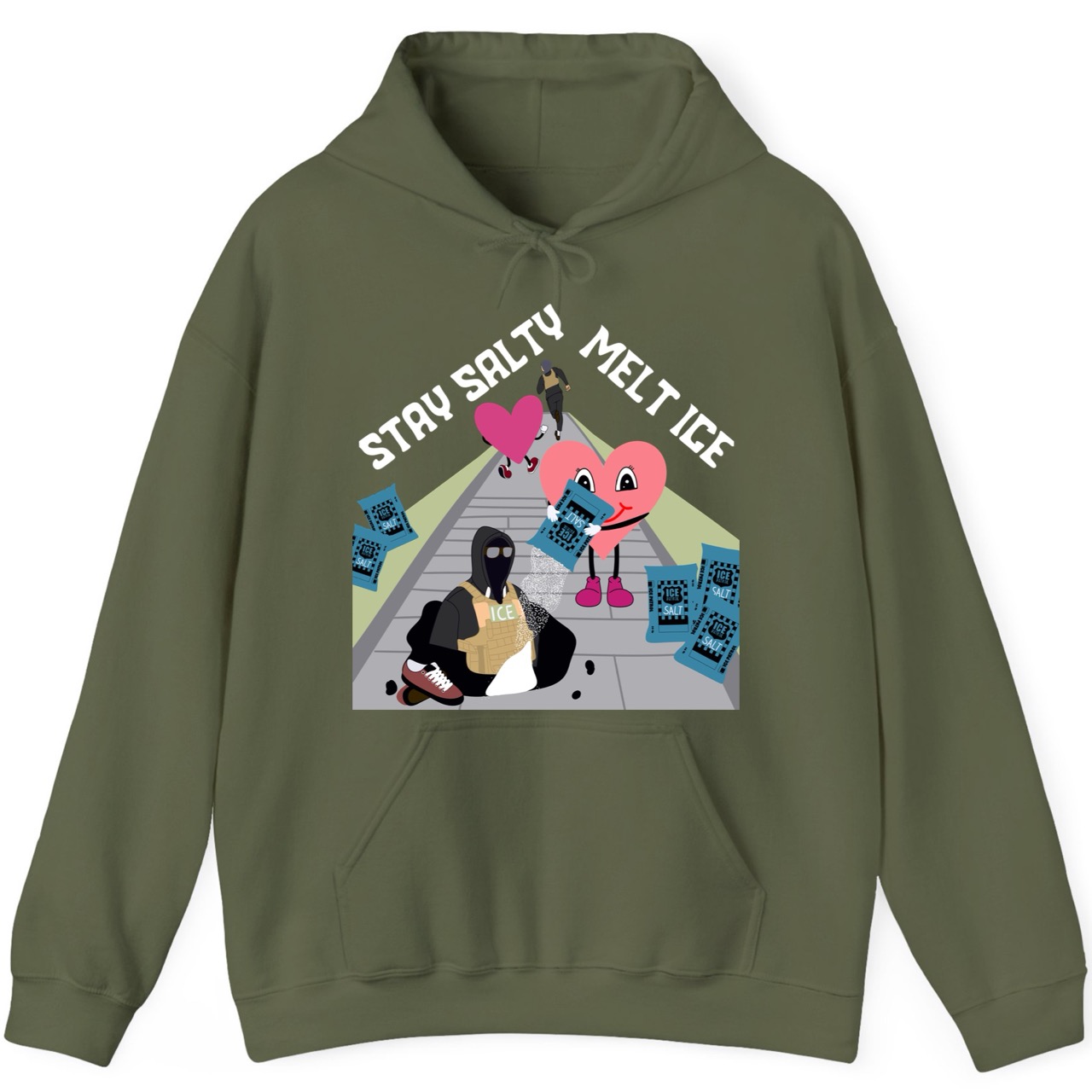 This Delulu Tees original graphic hoodie features the phrase “Stay Salty and Melt ICE” across the top, pairing sharp wordplay with an unmistakable anti-ICE message. Below the text is a detailed cartoon scene built around a simple idea: salt melts ice. Two cute, anthropomorphic heart characters take action in a playful yet pointed illustration. One heart tips a massive salt container onto an ICE “Officer”, leaving only the mask, glasses, the vest marked “ICE,” and shoes behind as the rest melts away. Scattered around the scene are oversized salt containers, reinforcing the message and adding extra visual punch. In the background, another ICE officer runs away, seen from behind, while a second heart chases after them, turning the design into a full story that reads instantly from across the room. Bright, cartoony, and packed with meaning, this hoodie is made for people who want activist art that stands out, sparks conversation, and clearly supports immigrant communities. Designed, printed, and produced in-house in California by real people, it reflects Delulu Tees’ commitment to original, human-made artwork with a point of view.