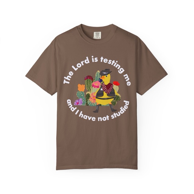 This Delulu Tees original t-shirt features a cartoon duck dressed in full western attire, including a cowboy hat, vest, belt, and badge, standing in front of desert cacti. The shirt displays the phrase “The Lord is testing me and I have not studied,” pairing unfortunate relatability with a southern twang. Perfect for fans of funny t-shirts or cowboy ducks, this design blends absurdity and playful character art into a wearable statement. Drawn to feel lighthearted, hopeful, and expressive, the artwork reflects Delulu Tees’ love for playful creativity and honest self expression. Designed, printed, and produced in house in California by real people, (sibling co-owners Kalie and Darian) this shirt brings creativity, quality, and honesty together in a wearable piece of art.