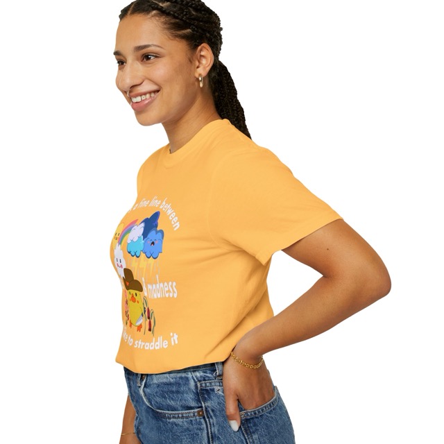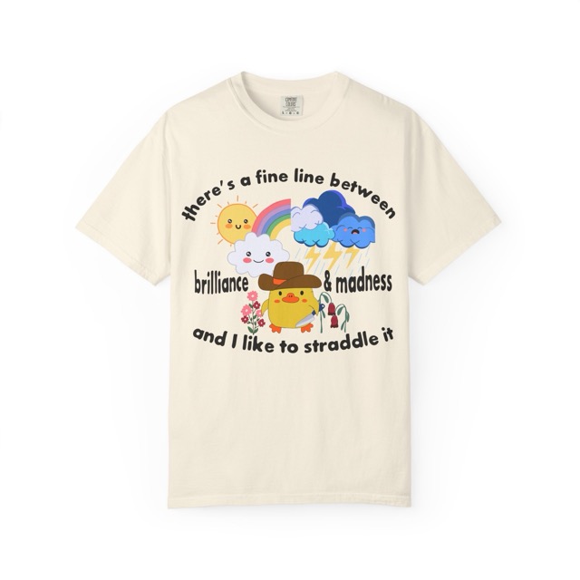 This Delulu Tees original tee features the phrase, ” there’s a fine line between brilliance and madness and I like to straddle it”, centered around an adorable chicken wearing a cowboy hat and holding knife. The design is split visually down the middle. One side shows healthy flowers beneath a smiling sun, a cheerful cloud, and a bright rainbow, representing brilliance. The other side shows dead flowers beneath dark storm clouds, lightning, and pouring rain, representing madness. The contrast creates a playful yet thoughtful scene that blends humor, chaos, and charm into a bold and memorable design. This tee reflects Delulu Tees’ love for playful creativity and honest self expression. Designed, printed, and produced in house in California by real people, (sibling co-owners Kalie and Darian) this hoodie brings creativity, quality, and honesty together in a wearable piece of art.